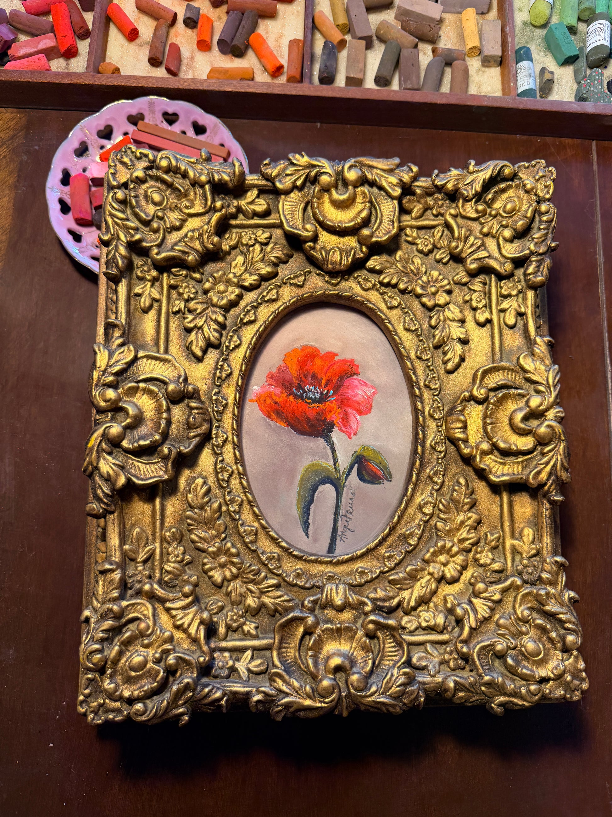 A single poppy blooms boldly with in a gilded antique frame. A tribute to the quiet strength and filleting beauty found in natures simplest moments. A timeless accent for collectors who appreciate both fine art and the elegance of antiques. 12x14x4