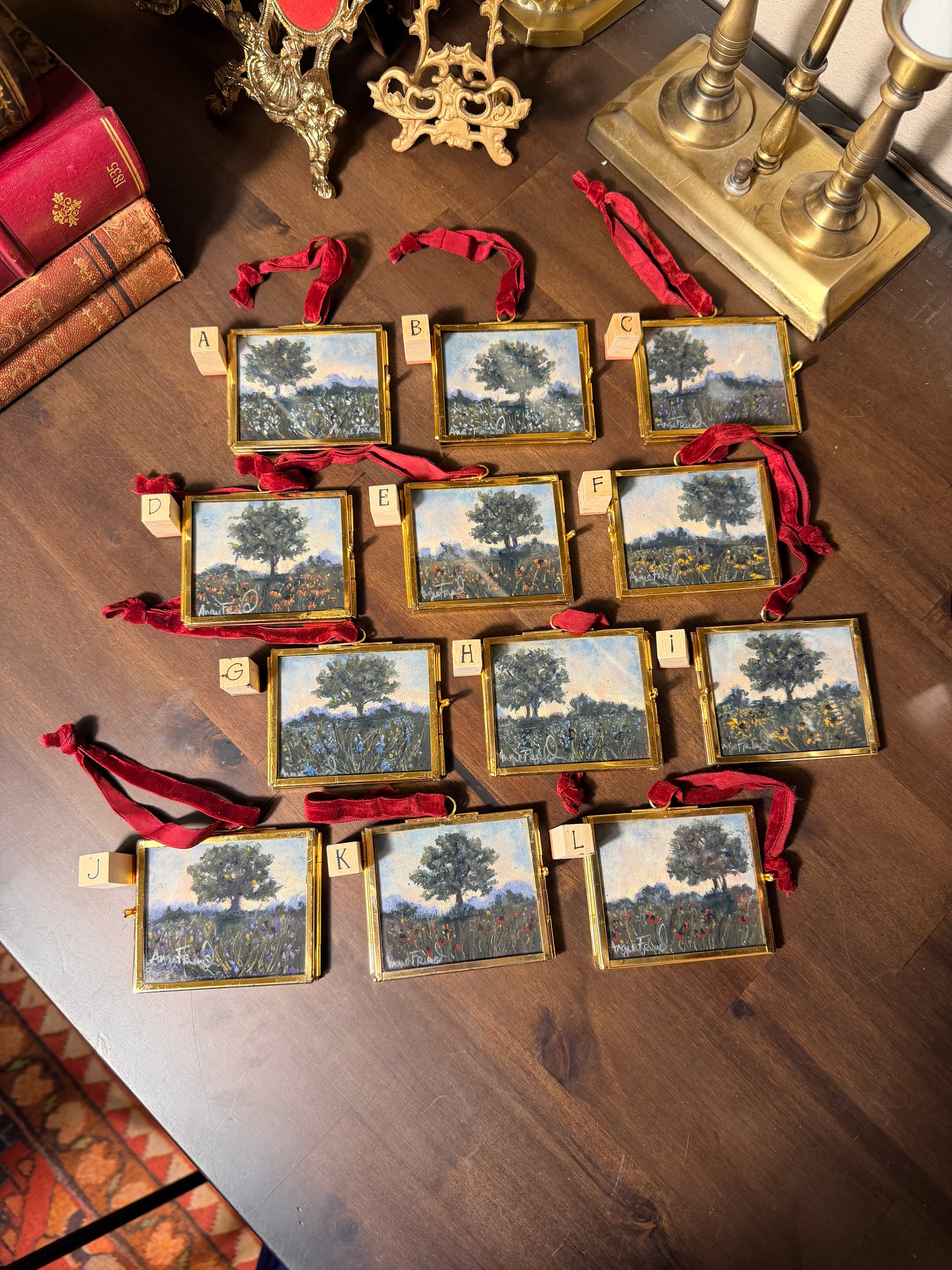 A soft collection of tiny original wildflower landscapes, created to bring a gentle touch of beauty to the little corners of your home. Each piece is framed in its own unique gold frame with a velvet ribbon. the 3X2.5 size tucks effortlessly into everyday spaces.Perfect for for gifting, collecting, and brightening the places we often overlook.